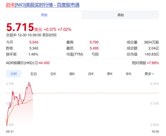 蔚来美股开盘阶段大幅拉升,涨幅超过7%。
