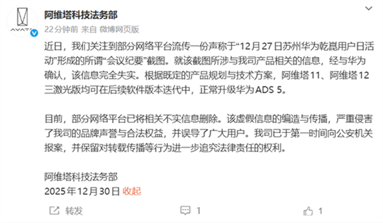 就该截图所涉与我司产品相关的信息,经与华为确认,该信息完全失实。根据既定的产品规划与技术方案,阿维塔11、阿维塔12三激光版均可在后续软件版本迭代中,正常升级华为ADS 5。