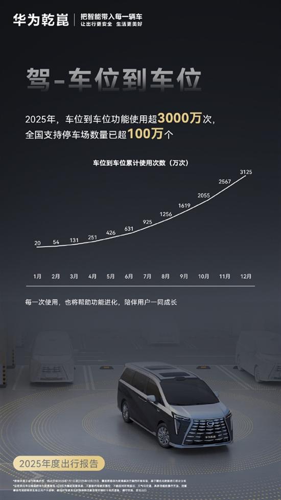 报告显示,2025年华为乾崑智驾车位到车位功能全年使用超3000万次,覆盖全国超100万个停车场,且使用频次随月份持续攀升。