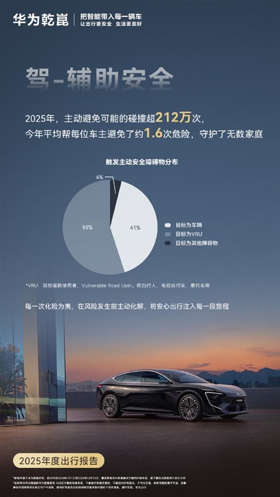安全层面,2025年华为乾崑智驾主动避免碰撞超212万次,平均每位车主被帮助规避约1.6次危险,其中针对车辆、行人/非机动车(VRU)的避险占比分别达41%、55%。