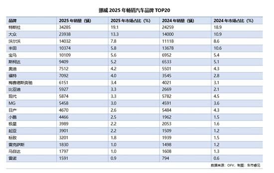 2025年北欧市场的品牌竞争图谱展现出特斯拉的主导地位和中国品牌的崛起。在挪威,特斯拉以19.1%的市场份额遥遥领先,年度共注册34,285辆新乘用车,Model Y以27,621辆的注册量创下挪威单车年度销售纪录,证明了其强大的产品力与品牌号召力。