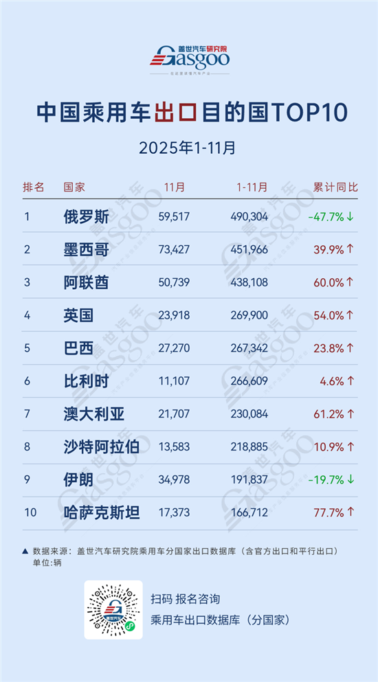 NO.1 俄罗斯,2025年1-11月,向俄罗斯出口乘用车490,304辆,11月单月出口59,517辆,累计同比减少47.7%。
