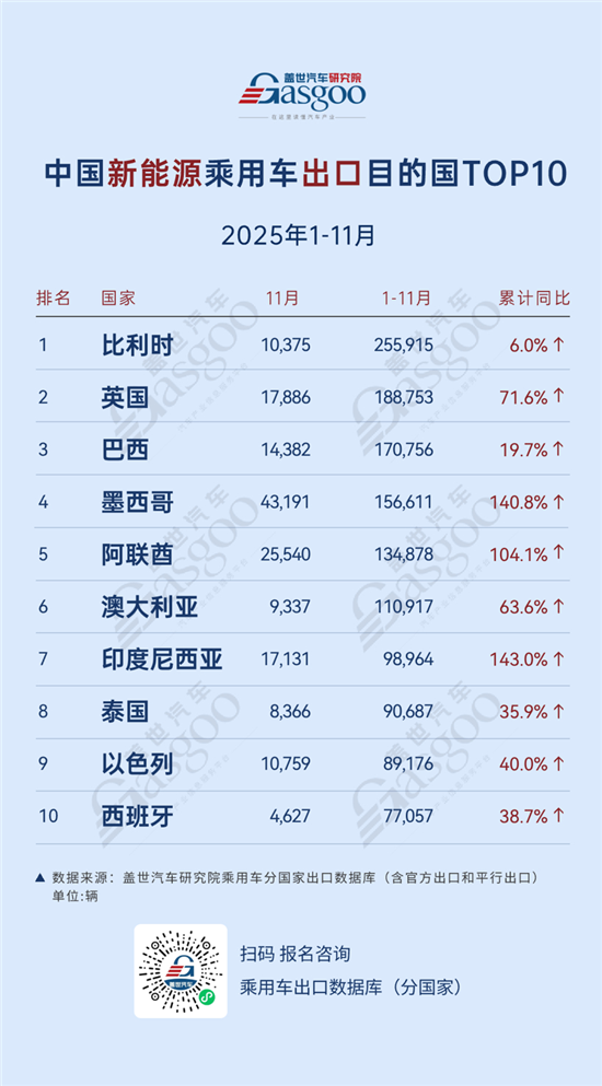 NO.1 比利时,2025年1-11月,向比利时出口新能源乘用车255,915辆,11月单月出口10,375辆,累计同比增长6.0%。