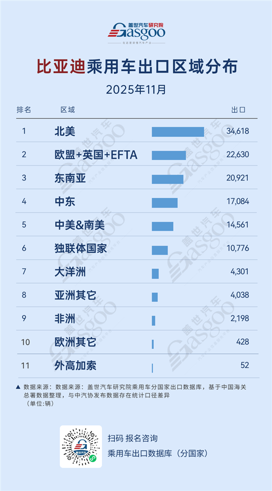 根据盖世汽车研究院出口数据库,2025年11月比亚迪乘用车出口区域排行榜如下: