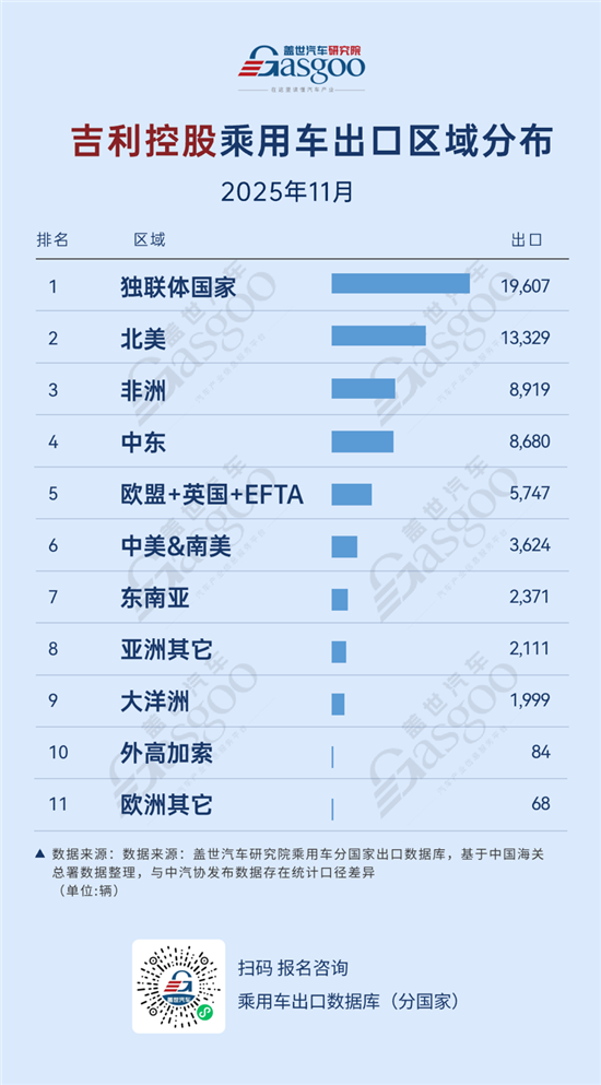 根据盖世汽车研究院出口数据库,2025年11月吉利控股乘用车出口区域排行榜如下: