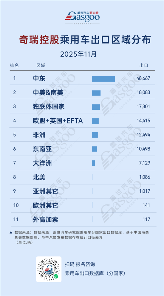 根据盖世汽车研究院出口数据库,2025年11月奇瑞控股乘用车出口区域排行榜如下: