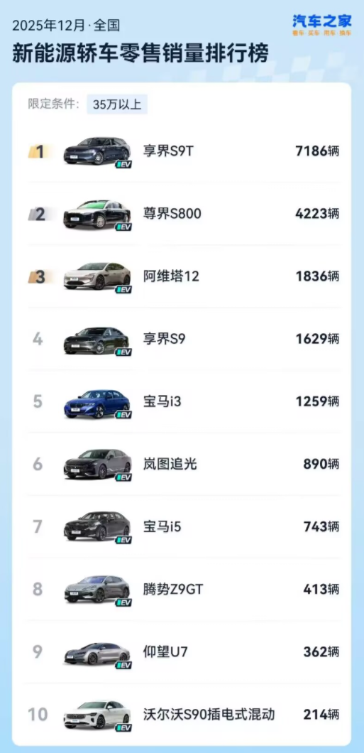 汽车平台榜单显示,在12月份35万元以上的中大型车和新能源车销量榜中,鸿蒙智行旗下的享界已成最亮眼的黑马品牌。
