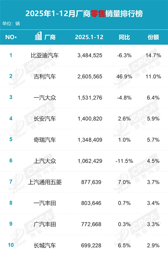 乘联分会公布了国内汽车市场12月及2025全年的乘用车销量数据。
