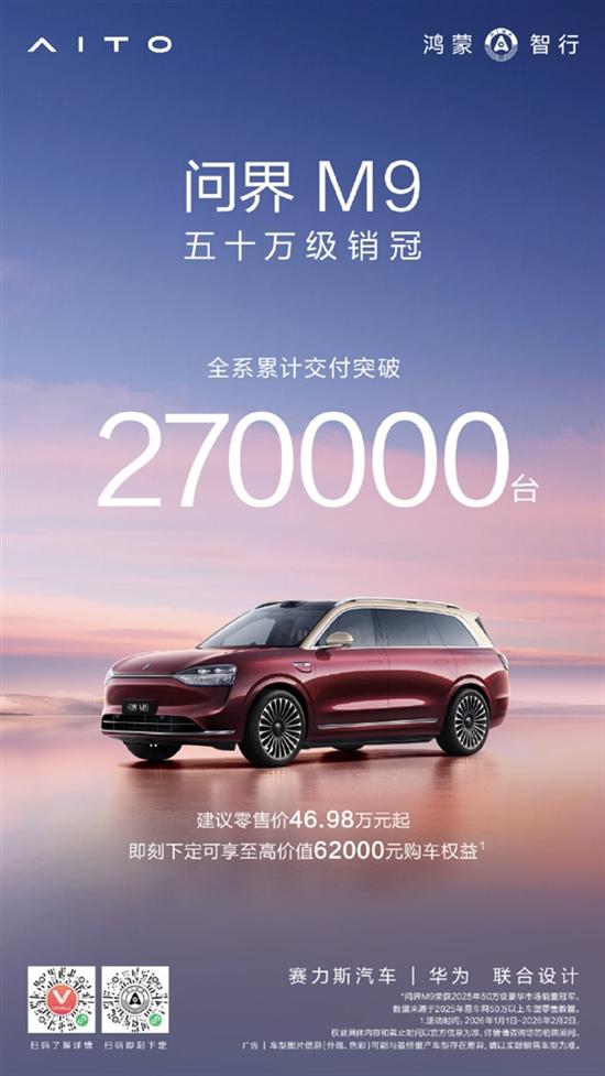 数据统计显示,问界M9上市两周年累计交付超27万辆,创50万元级车型交付纪录。