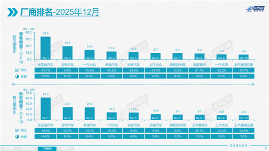 从厂商排名来看,比亚迪汽车分别以34.0万辆的零售量位居第一,但其零售量同比下滑超过15%。