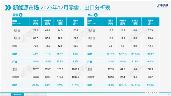 值得关注的是,新能源汽车在整体市场中扮演了稳定器的角色,12月新能源乘用车市场零售133.7万辆,同比增长2.6%;1-12月累计零售1280.9万辆,渗透率达53.9%。这标志着其正逐步成为中国汽车市场的销售主力。
