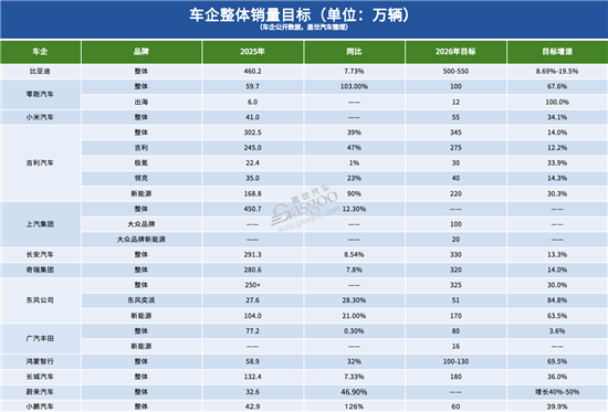 相比之下,传统车企在目标设定上更加克制。传言比亚迪2026年销量目标为500-550万辆,同比增幅最低仅9%。