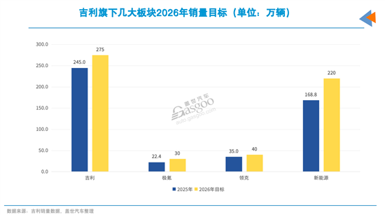 吉利汽车2026年销量目标为345万辆,较上年增加43万辆,同比增幅仅14%。具体到各品牌2026年目标:吉利品牌275万辆、极氪30万辆、领克40万辆;新能源板块目标222万辆,较2025年增长30%。