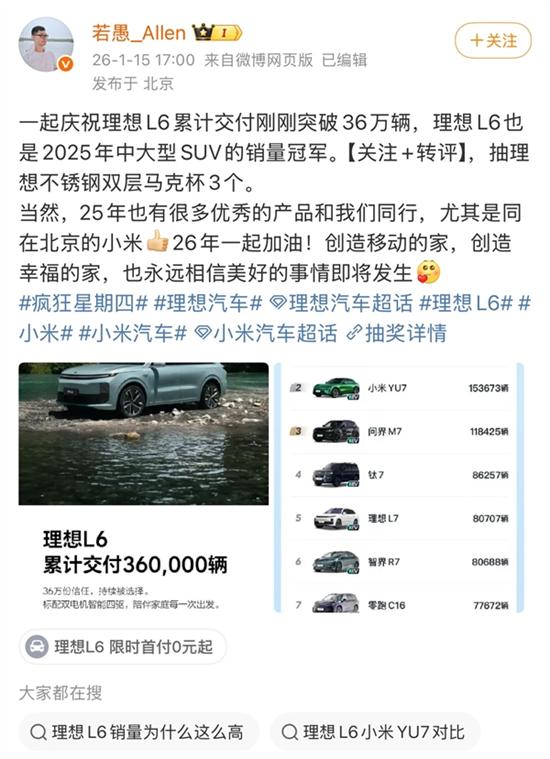 理想汽车产品经理@若愚_Allen宣布,理想L6累计交付量已突破36万辆,这款车型同时拿下2025年中大型SUV销量桂冠。
