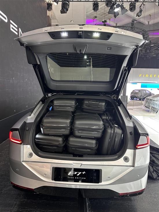 小鹏汽车为演示新款小鹏P7+恐怖的装载能力,在不侵占前排驾乘人员空间的情况下,陆续从车内拿出了33个20寸的行李箱。