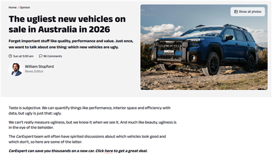 澳大利亚汽车媒体CarExpert近日评选了2026年澳大利亚上市最丑的新车。