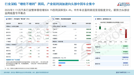 存量市场还有一个典型的特征——强者愈强,弱者出清的马太效应。这一点在盈利表现上呈现得尤为残酷和清晰,盖世汽车研究院整理的财报,就揭示了一个鲜明的盈利剪刀差格局,2025年前11个月,国内汽车行业整体营收增长了8.1%,但利润率仅4.4%,中外车企的盈利表现呈现极度分化。