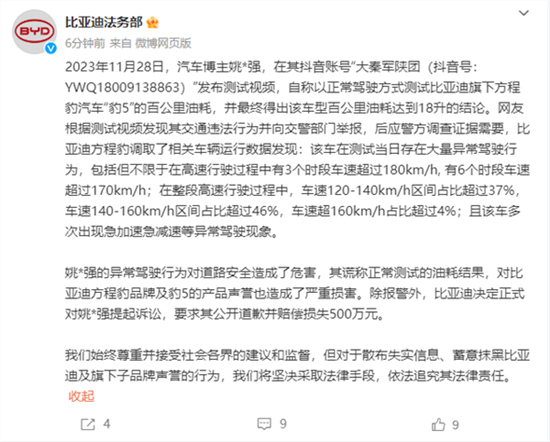 2023年11月28日,汽车博主姚*强,在其抖音账号“大秦军陕团(抖音号:YWQ18009138863)”发布测试视频,自称以正常驾驶方式测试比亚迪旗下方程豹汽车“豹5”的百公里油耗,并最终得出该车型百公里油耗达到18升的结论。