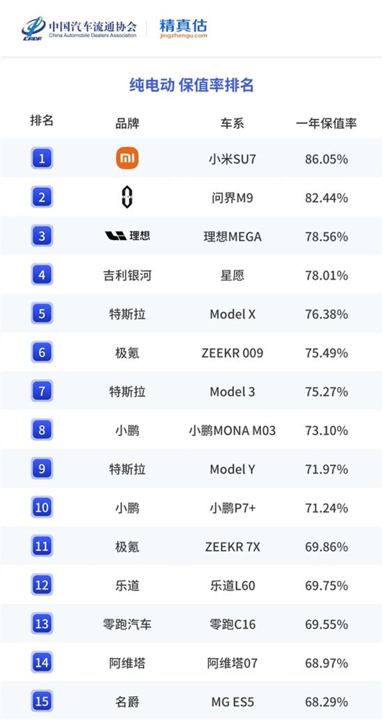 小米汽车官宣,中国汽车流通协会和精真估发布了《2025年度中国汽车保值率报告》,其中小米SU7在纯电动车领域豪取第一名。