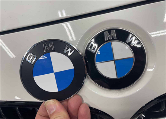 新Logo核心变化为取消内圈镀铬环与蓝白分割镀铬条,将黑色外圈改为哑光缎面质感,保留外圈镀铬但采用烟熏效果,同时统一燃油与电动车型标识,不再用蓝色外圈区分电动车。