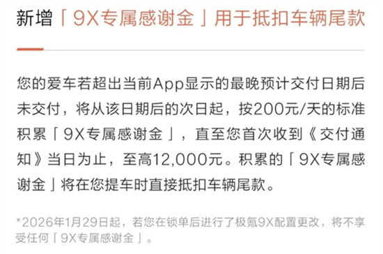 对此,极氪针对交付延期推出了补偿措施,若超出当前App显示的最晚预计交付日期后未交付,极氪将从该日期后的次日起,按200元/天的标准积累“9X专属感谢金”,直至用户首次收到《交付通知》当日为止,至高12,000元。积累的9X专属感谢金将在提车时直接抵扣车辆尾款。