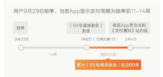 此外,对于已完成9X提车的用户,且实际交付时间超出App显示的最晚交付日期,极氪将根据您极氪App首次收到《交付通知》站内信的日期,计算您积累的9X专属感谢金,以1元=10极分的兑换比例,以极分的形式发放至车主手机号注册的极氪App账户内。