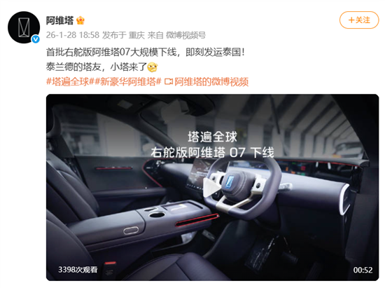 1月28日晚,阿维塔官方宣布,首批右舵版阿维塔07大规模下线,即刻发运泰国。此前,在2025年11月,阿维塔07已在泰国海外首发。