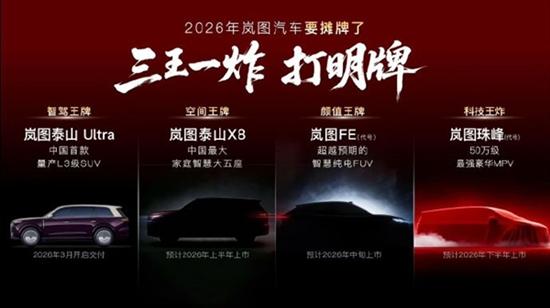 这四款车型被宣称为“三王一炸”,覆盖三大品类,其中岚图泰山Ultra预计将于3月开始交付。