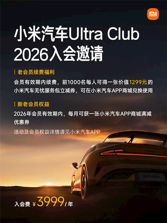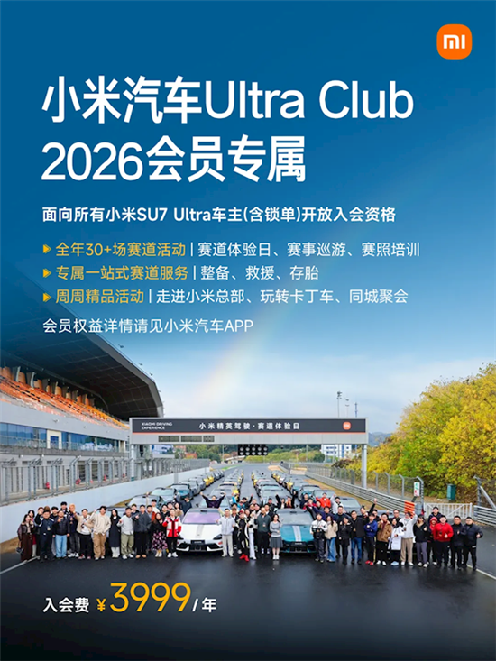 备受关注的小米汽车Ultra Club正式公布了2026年的会员权益升级方案,入会费用维持在3999元/年。