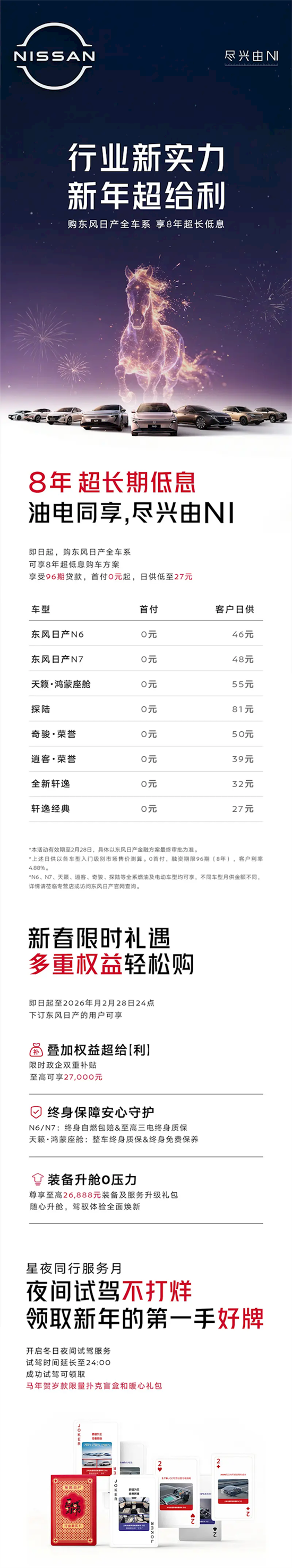 即日起至2月28日,全系车型享8年超长期低息,N6、N7、天籁、逍客、奇骏、探陆等全系燃油及电动车型均可享,0首付,日供低至27元。