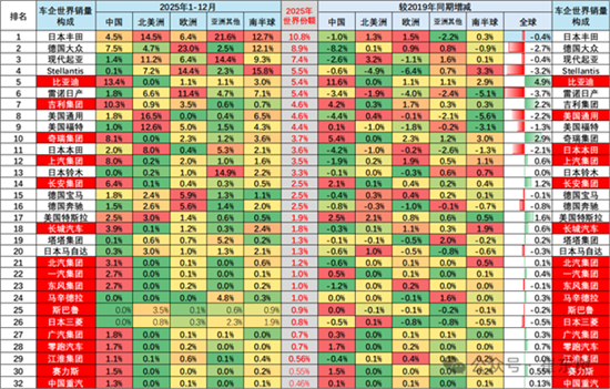 与之形成对比的是,前十名中,传统国际车企份额全部下滑。大众、Stellantis等欧洲车企2025年全球份额较2019年分别下降2.7%、3.2%,日本本田份额较2019年下滑0.4%,美国福特、通用等品牌也增长乏力。