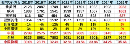 回顾过往,2016-2018年中国汽车占世界30%左右;2019年下降到29%,但仍具有绝对优势;2020-2021年份额回升到32%;2022年中国份额上升到33.5%;2023年中国份额保持在33.8%;2024年中国达到世界汽车的34.2%的份额;2025年1-12月中国达到世界汽车的35.6%的份额。