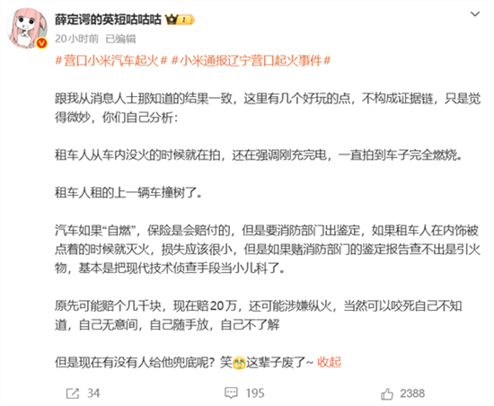 最近,一条 “小米汽车起火放烟花” 的视频在社交平台广为流传。对于新能源来说,起火天生自带流量 buff,加上 “放烟花” 的叠加 buff,一下就爆了。
