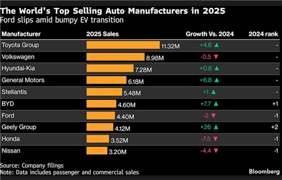 数据显示,福特汽车2025年批发销量同比下降近2%,略低于440万辆,这一数据不及比亚迪此前公布的460万辆销量。