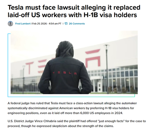查布里亚法官在周一晚间发布的简短裁定中,准许陶布的诉讼请求继续推进。诉讼指出,特斯拉2024年在本土裁员超6000人(其中绝大多数被认定为美国公民)的同时,新聘用了约1355名H-1B签证持有者。