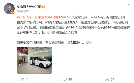 汤靖称,大家常问我,MEGA有没有增程的计划,在此和大家再明确下啊,MEGA之所以是MEGA,是因为它纯电的架构,车头部分只留下了极短的,必要的碰撞溃缩空间(MEG A 是中保研第一台获得3G+最高碰撞安全评级的车型),把可用空间都留给了舱内。