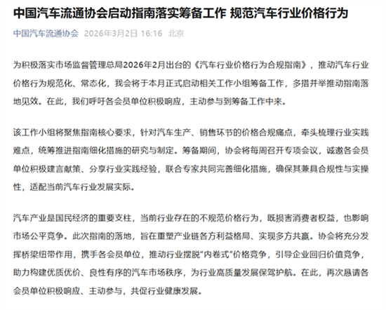 中国汽车流通协会发文称,为积极落实市场监督管理总局2026年2月出台的《汽车行业价格行为合规指南》,推动汽车行业价格行为规范化、常态化,我会将于本月正式启动相关工作小组筹备工作,多措并举推动指南落地见效。