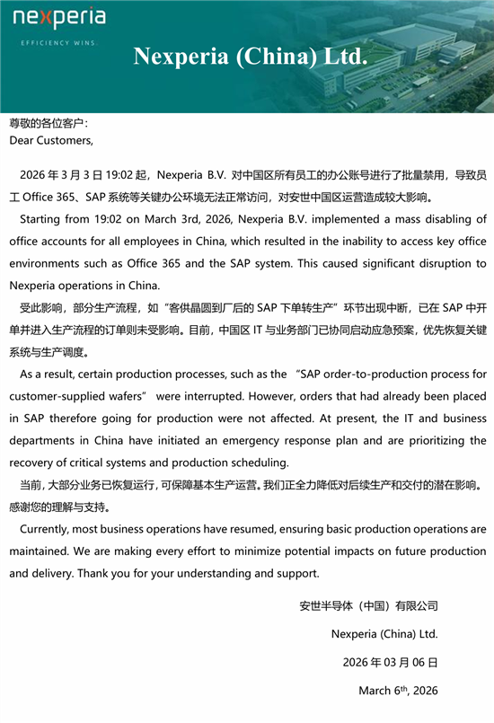 2026年3月6日午后,安世半导体向客户发布公告函称,其核心办公与生产系统日前遭遇了突发性瘫痪。