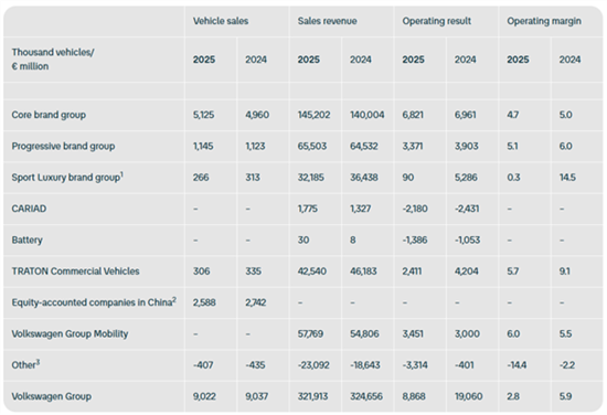 大众汽车集团发布了2025财年业绩报告,集团全年营业利润达88.68亿欧元,较2024年的190.60亿欧元大幅下滑53.5%,经营回报率从5.9%降至2.8%。