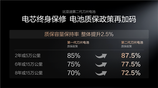 更狠的是,二代刀片电池密度更高、充电更快,比亚迪反而加码了质保政策,将此前一代刀片电池6年或15公里,电池容量75%的质保线,提升到了77.5%,这波升级也能感觉到比亚迪对二代刀片电池的技术和质量信心有多足。