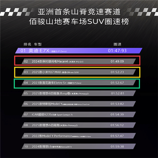 近日,上汽奥迪AUDI E7X以1分47秒93的成绩完成亚洲首条山脊赛道测试,成绩优于小米Yu7 Max等多款性能SUV,成为该赛道SUV组别最快车型。
