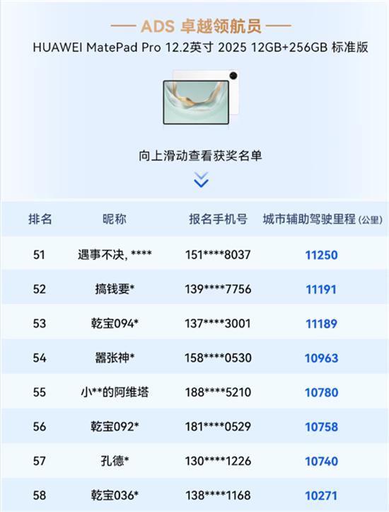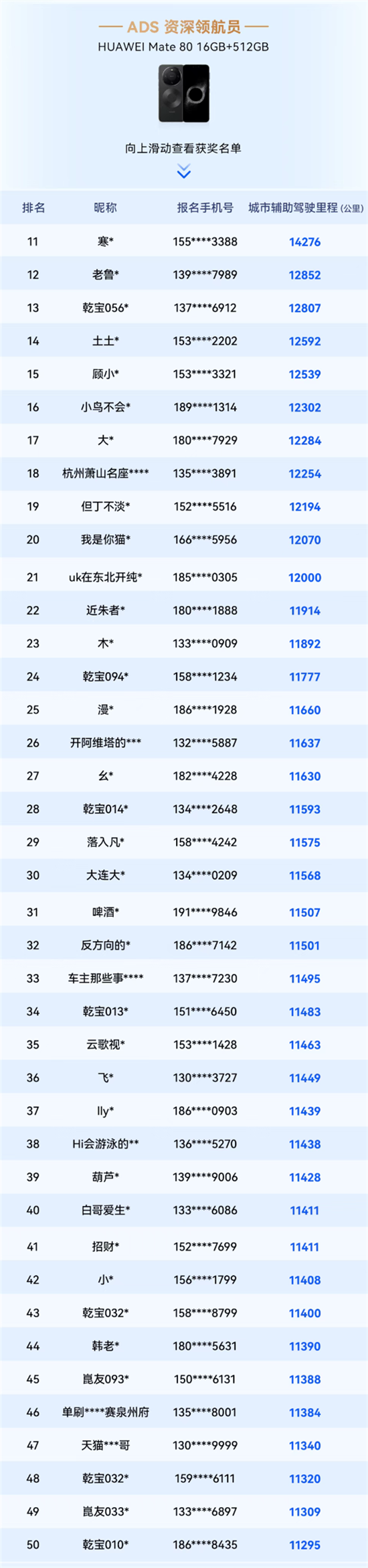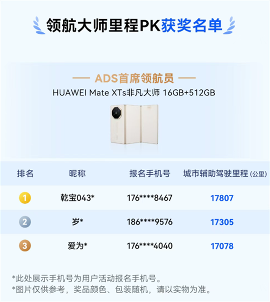 获得ADS首席领航员的共有三人,奖品为华为Mate XTs非凡大师(16+512GB),比赛期间,三人城市辅助驾驶里程均超过1.7万km。