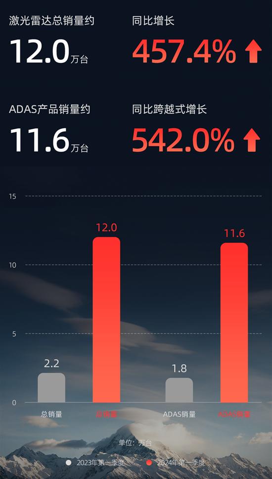 这主要得益于激光雷达产品销量的增长。2024年第一季度,速腾聚创激光雷达产品总销量约12.0万台,其中用于ADAS应用的激光雷达产品销量约11.6万台,与2023年同期分别增长457.4%、542.0%。