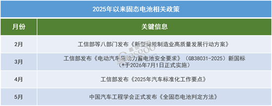 企业进一步深入固态电池技术研发并纷纷定下量产上车事件节点的背后,离不开国家政策的推动,尤其是今年以来,固态电池相关利好政策密集发布,2月份,工信部等八部门发布《新型储能制造业高质量发展行动方案》,明确将固态电池列为重点攻关方向,支持锂电池、钠电池向固态化发展,并提出2027年前打造3-5家全球龙头企业。随后的4月,工信部又发布《2025年汽车标准化工作要点》,将固态电池写进全局规划与前瞻布局。