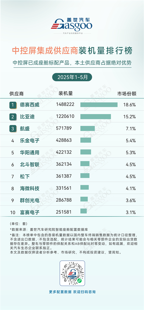 中控屏集成市场呈现本土厂商主导的市场格局。榜单前五名中,本土供应商(德赛西威、比亚迪、航盛、华阳通用)占据四席,合计份额超50%,说明本土企业在技术整合和成本控制上占据绝对优势。其中,德赛西威以148.8万套的装机量(18.6%)再度领跑,比亚迪凭借122.1万套(15.2%)紧随其后。从市场趋势来说,中控屏的标配化推动需求持续扩容,但同质化竞争也在加剧,未来竞争焦点在于“软件定义屏幕”——对算法、软件和内容生态的整合创新。