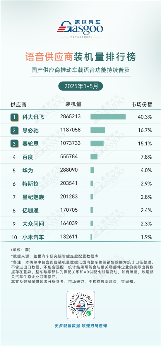根据盖世汽车研究院发布的2025年1-5月智能座舱供应商装机量排行榜,这一时期内,多领域市场高度分化且头部效应显著: 从座舱域控(德赛西威领衔)、芯片(高通占据75.9%)到语音交互(科大讯飞占40.3%),头部企业形成了断层领先的优势。
