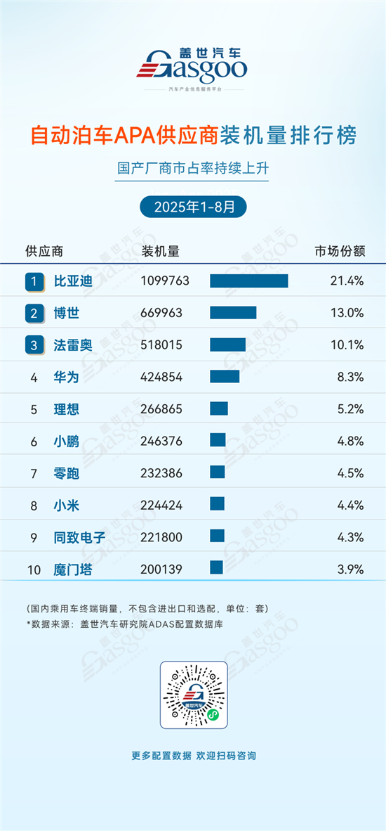 1-8月,自动泊车(APA)市场中 “国产厂商市占率持续攀升” 的趋势愈发显著。比亚迪以21.4%的市场份额领跑行业,领先优势持续扩大;华为、理想、小鹏、小米等国产车企与科技企业协同发力,与博世、法雷奥等外资品牌共同构建起多元竞合的市场格局。这一态势充分反映出国内APA技术商业化落地的加速,以及汽车供应链自主化能力的显著跃升。新势力车企与科技企业在APA赛道的深度布局,进一步加剧了市场竞争。在技术迭代与成本优化的双重驱动下,国产APA解决方案的市场竞争力持续提升,为智能泊车功能的大规模普及注入了强劲动能。