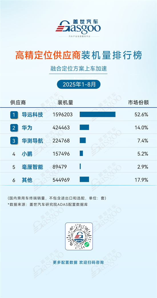 1-8月,高精定位市场延续 “一超引领+多强竞合” 的格局。导远科技以 52.6%的市场份额和超159万套的装机量稳居榜首,凭借在融合定位领域的技术积淀与规模化优势,牢牢把控绝对主导权;华为以14.0%的份额位居第二,彰显其在智能汽车技术生态中的深度渗透能力;华测导航、小鹏等企业分别以 7.4%、5.2%的份额分食市场,反映出行业参与者的多元化布局特点。“其他” 供应商合计占比17.9%,反映出市场仍有大量参与者在细分领域展开角逐。在融合定位方案加速上车的行业背景下,头部企业依托技术壁垒与规模效应持续巩固领先优势,中小供应商需在细分场景或技术路线上寻求差异化突破,行业竞争围绕技术整合能力、车企合作深度不断升级。