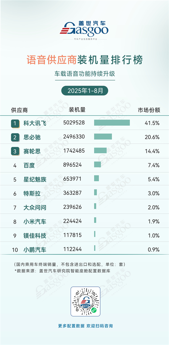 1-8月,伴随 “车载语音功能持续升级” 的行业趋势,本土供应商在语音市场中占据绝对主导地位。科大讯飞以41.5%的市场份额遥遥领先,超502万套的装机量构建起明显的头部优势,思必驰的市场份额超过20%,为车载语音功能的迭代升级提供了强劲动力。百度、星纪魅族等企业凭借自身生态资源跨界入局参与竞争,而特斯拉等外资厂商的市场份额则相对有限。整体而言,本土供应商依靠技术适配性、服务响应速度以及对国内用户需求的精准洞察主导着市场格局,后续技术的持续迭代能力、与智能座舱生态的融合深度将成为竞争的核心焦点,外资品牌需进一步加强本土化创新以提升市场影响力,行业在技术突破与场景拓展的双重驱动下,将持续为用户带来更为智能的语音交互体验。