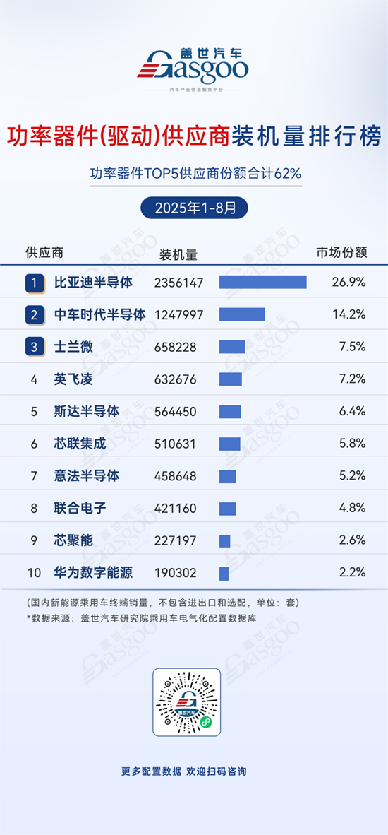 比亚迪半导体,2025年1-8月装机量2,356,147套,市场份额26.9%。
